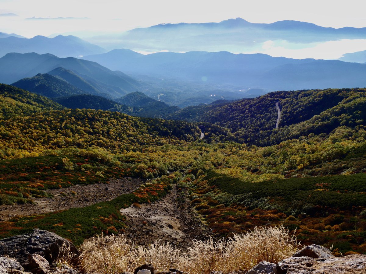 今年は行けなかった乗鞍岳エコーライン。2012年の撮影です。下段左の稜線の鞍部が畳平で、ここから車道を下ってくる。右下の位ヶ原山荘まで紅葉の中を歩く。活火山です。 https://t.co/WBMLC5kel0