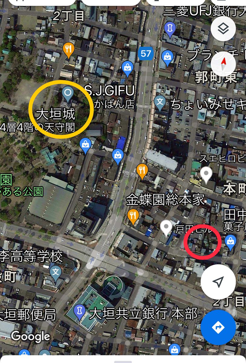 黄丸が大垣城 赤丸が大手門跡、広い敷地だったのだなあ。