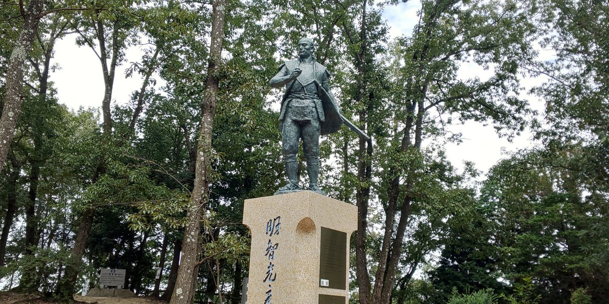 明智城の光秀像の碑文。これには光秀『公』と記載があるが、可児市内に光秀生誕の地の幕や貼紙はよく見かけたが全てが『光秀』と呼び捨て。可児市は出身地候補の一つであり、正直光秀が領主一族であった裏付けは無くここでは地元から大して敬われて… https://t.co/tW93ogWFaR