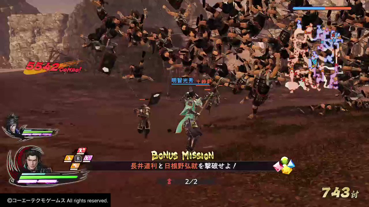 光秀のシナリオ1-4「明智城の戦い」、その5。「善龍の増援」はシナリオ終盤で勝利条件が変更された後に中央に出現する2人の敵武将のどちらかに近付くと発生。 #戦国無双5 #NintendoSwitch https://t.co/6PBSPw16Sv