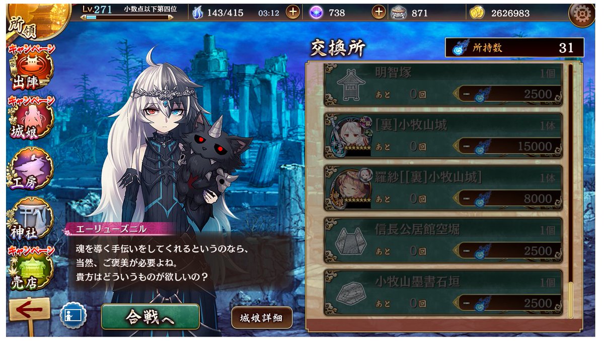 裏小牧山城交換できた!改築とか残ってるけどひとまず目標達成したので控えめに遊ぶモード