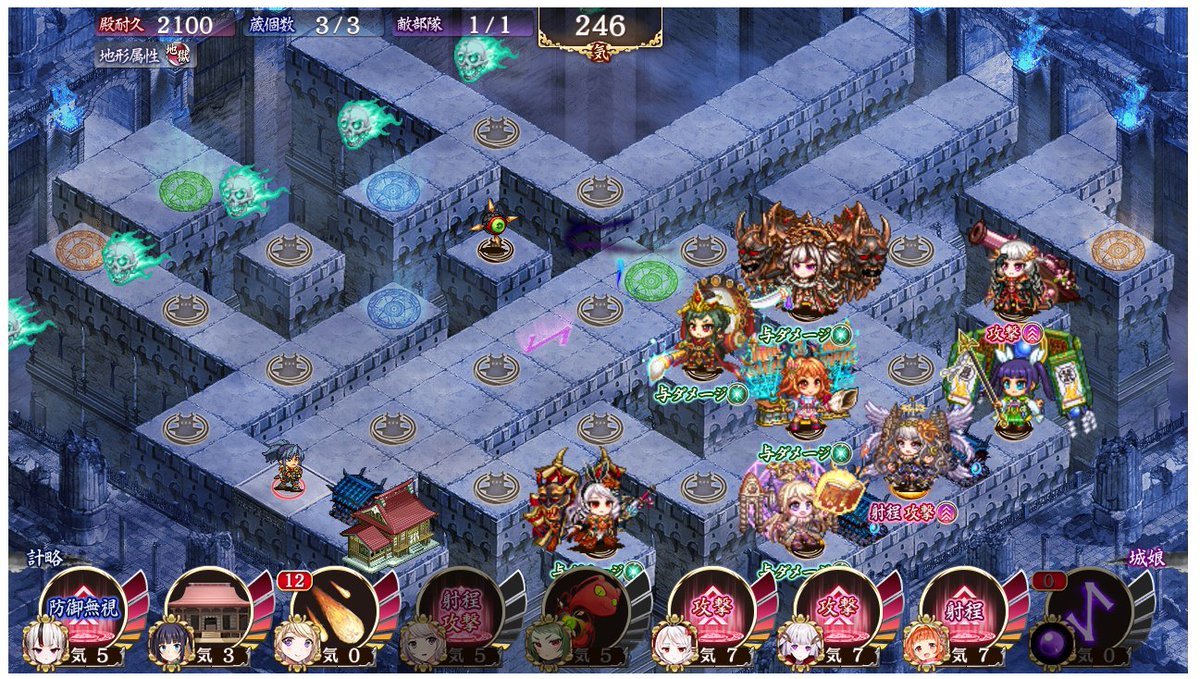 裏小牧山城最大化時特技で射程が伸びて死神本体へ攻撃しなくなるので狭間を外し巨大化を四回に抑えて施設は速度と隙短縮で