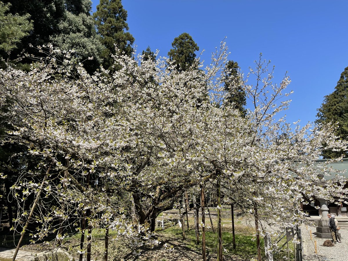 ふくしま桜紀行。移動中に訪れた桜を紹介します。その1。伊佐須美神社内にある淡墨桜はほぼ満開。白くまるまるとした花が晴天の空に輝いています。#ふくしま桜紀行 https://t.co/9TTltVSfnE