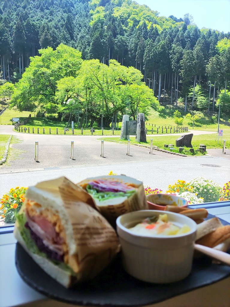 根尾の淡墨桜(葉っぱ)を眺められる特等席でサンドイッチいただきま〜す