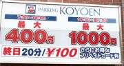 この周辺には有料駐車場が多くあります。そのなかでおすすめなのは「パーキングKOYOEN」です。長時間駐車しても最大400円で、駐車スペースも多く、土曜日のイベント開催時でも空きスペースに余裕がありました。会場までの距離も近く徒歩で2分程度です。