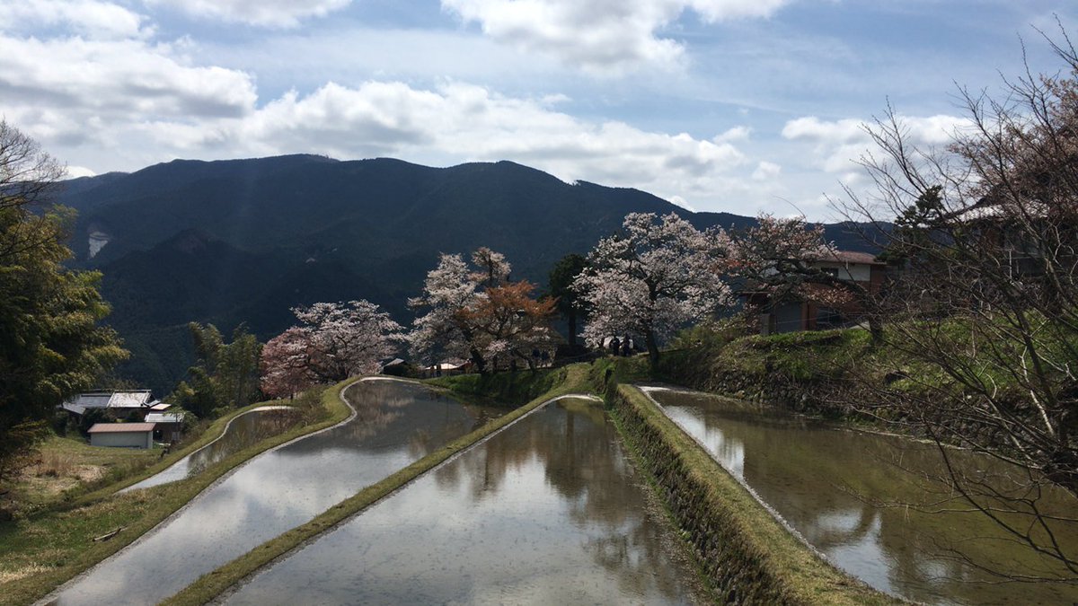 曇り予報だし、ソメイヨシノはほとんど散ってましたが、雲の合間に青空が顔を出し棚田に映る桜が撮れました。やったね! https://t.co/0BpogLhaFC