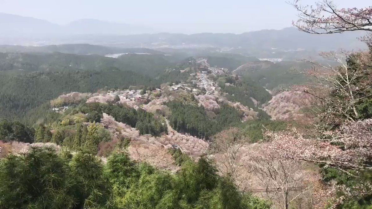 吉野山花見矢倉から上千本・中千本を一望。見事な満開、桜の海です。 https://t.co/kzKF01UFqx