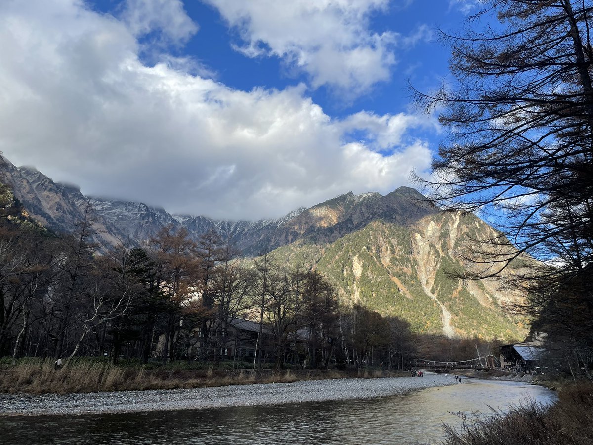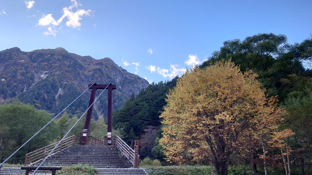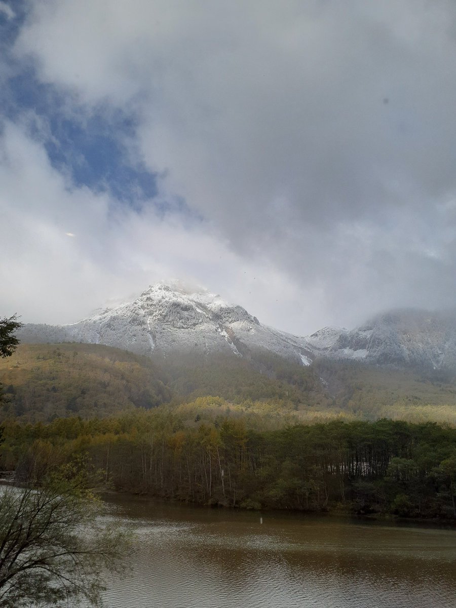 焼岳や周囲の嶺は、中腹から上が雪化粧。中腹から下の紅葉が萌える景色とのコントラストに、『秋と冬の境界線』にいることを実感しています。 https://t.co/Ye0cQJehhR