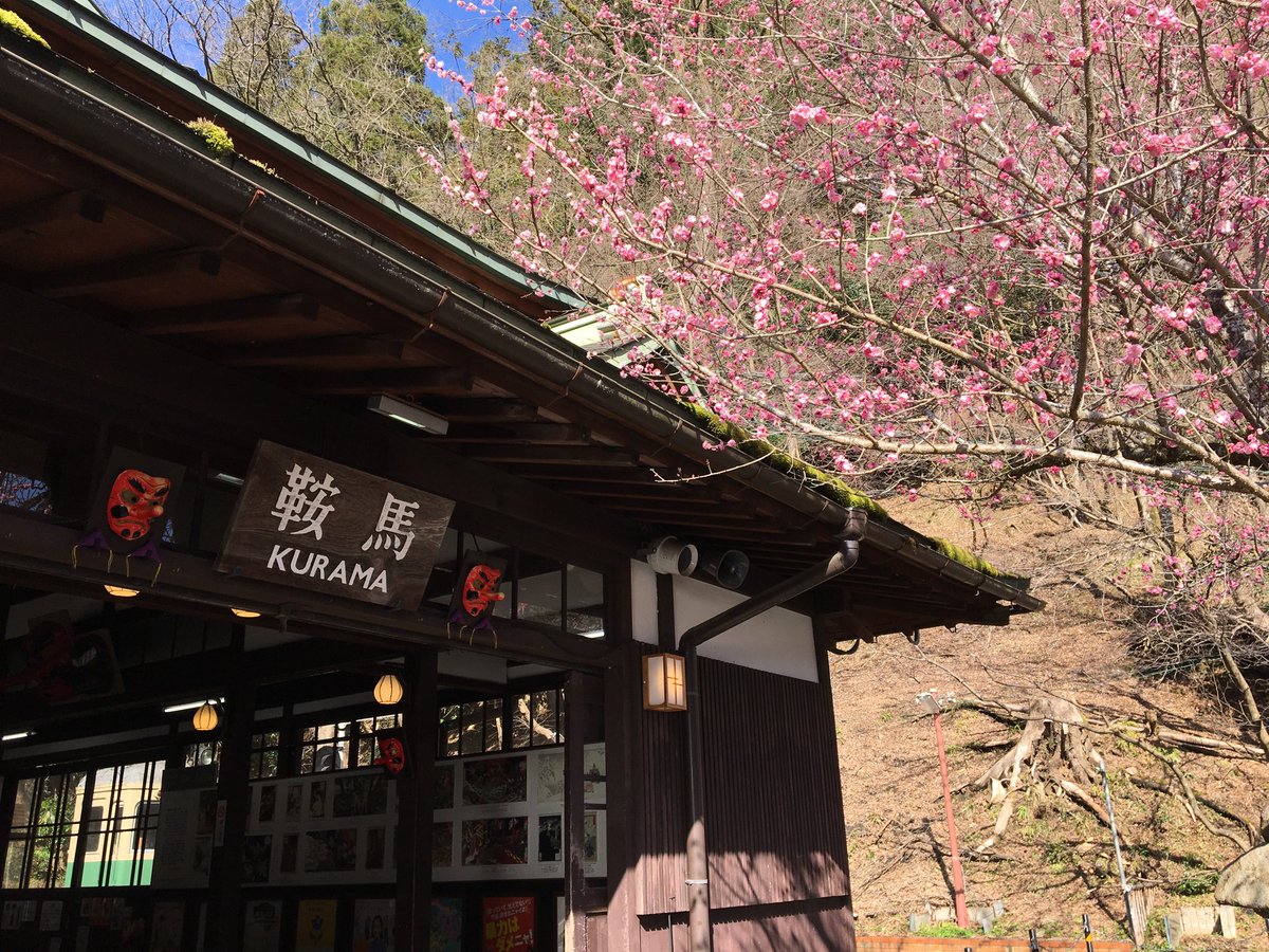 叡山電車、鞍馬駅。梅と大天狗、御利益ありそう