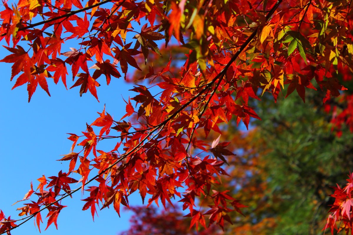 朱、黄、緑 三色葉っぱのもみじの木が多かった。