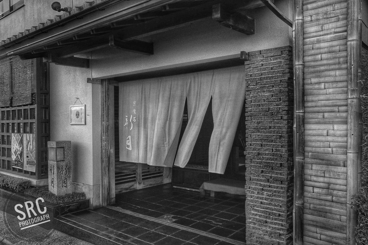 石山寺の近くの料理屋さん。真っ赤なのれんがきれい。モノクロだけど...