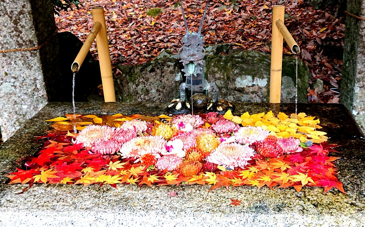 手水舎のところがお花で可愛くしてあったり、紅葉が落ちて綺麗やった~✨ https://t.co/G8L3yb1J00
