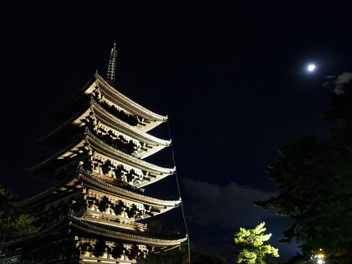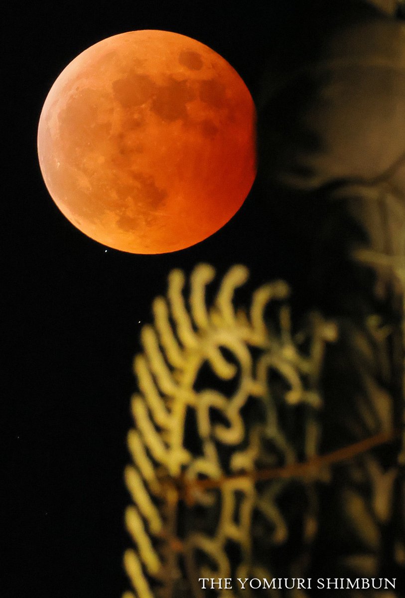 奈良市の興福寺では、約120年ぶりの大規模修理が行われる国宝の五重塔の上空に皆既月食で赤銅色になった月が浮かんだ。月の下にあるのは天王星(8日午後8時29分、奈良市で)(taku) https://t.co/dMn3JJ01wD