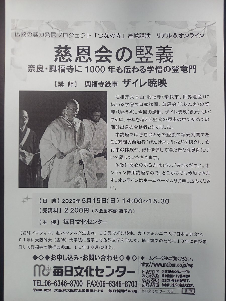 こちらの講座も近づいています!奈良・興福寺の口頭試問「竪義(りゅうぎ)」に合格したザイレ暁映さんに体験を語っていただく「つなぐ寺」連携一日講座は15日(日)午後2時毎日文化センターで。ハイブリッド講座です。#毎日文化センター https://t.co/826qIOpJBe