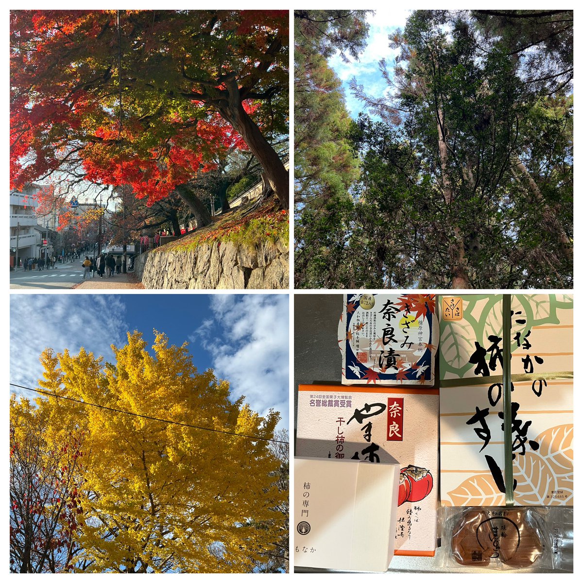 興福寺の見事な銀杏の木と真っ赤な紅葉。緑は春日大社で。楽しくなってお土産いっぱい買ってしまった。お昼に食べた奈良漬が美味しかったので奈良漬も。食べ切れるかな。 https://t.co/WqtgbLXsSV