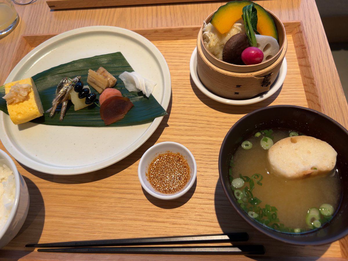 奈良の有名カフェがプロデュースのホテルの和朝食。荒池とホテルと興福寺の五重塔。