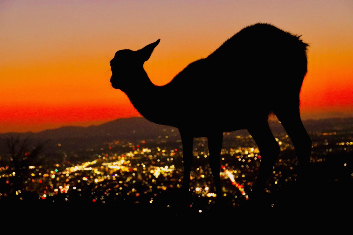 若草山山頂では夕陽が沈んだあと直ぐに帰ってはいけません。トワイライトタイムには空が茜色に染まり、暫くすると奈良の街並みが夜景として浮かび上がってきます。今日は、夕闇をさまよう鹿と夜景がうまく撮れました。 https://t.co/5OfUNRDDrp