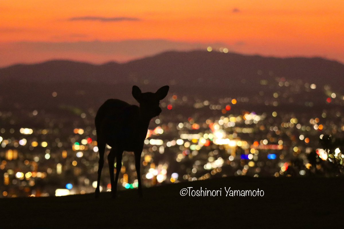 若草山に来たら撮らずにはいられない、夕焼けと鹿と夜景。 https://t.co/ui1s19jP4U