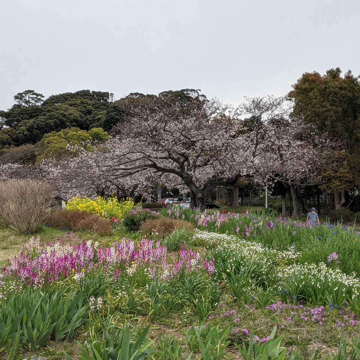 やっとこさ停めましたが、駐車場いっぱいに桜が咲き乱れていて、湖畔に行くよりここで花見が1番見応えがありそう状態。