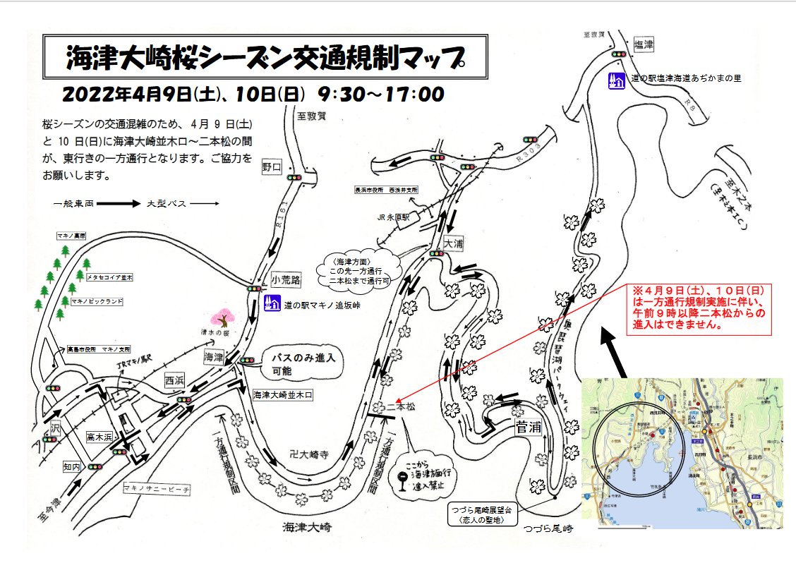 海津大崎の桜の交通規制は4/9(土)・4/10(日)9:30-17:00です。 https://t.co/zkBIgJ7rHa