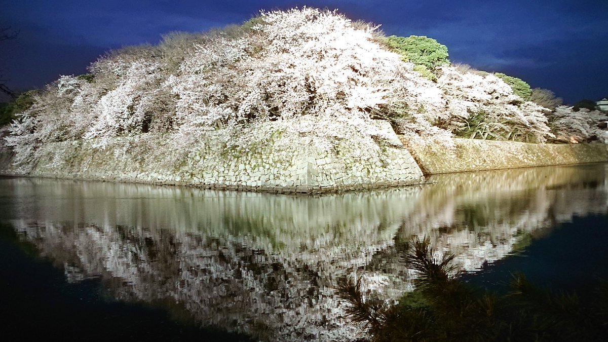 石垣の上から堀に映り込んでいる満開の。