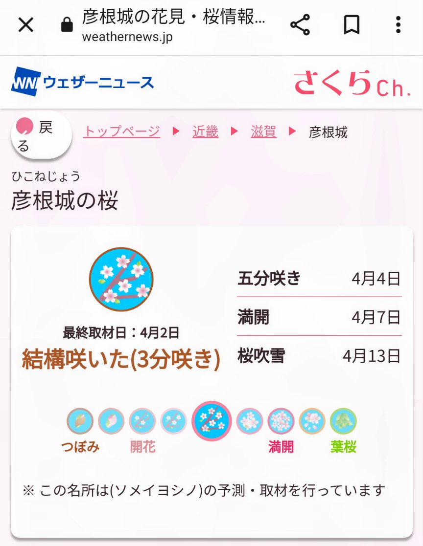 @sachi0403 はじめまして。ニシナナで彦根城の桜が満開と聞き、急遽愛知から今日彦根城と、あと近江八幡の水郷巡りに行ってきました。どちらも桜の時期に行くのが念願だったので。とても嬉しかったです。彦根城の桜、本当に素晴らしいですね!ありがとうございました!