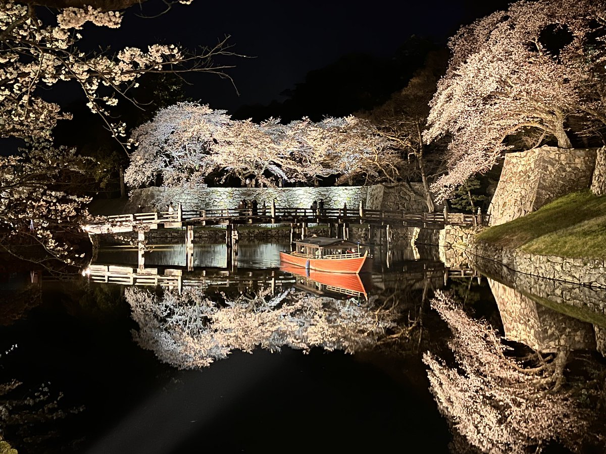 彦根城の桜のライトアップへ。満開の桜が咲き誇って心洗われる時間でした。湖面に映る逆さ桜と、遊覧船とがまた風情がありました