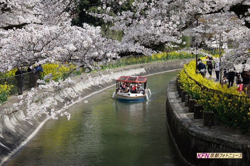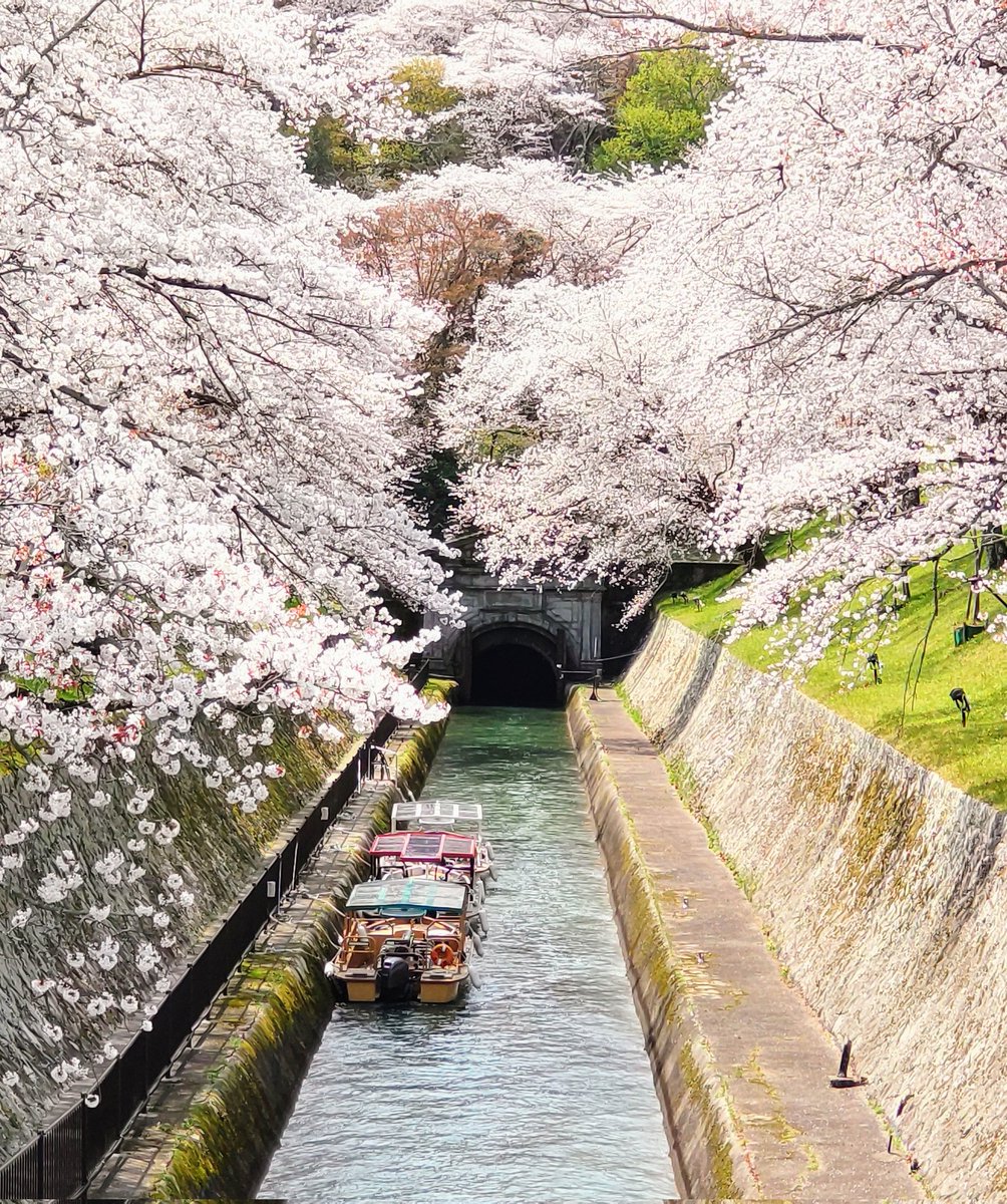 大津市の取水口から蹴上のトンネル水路まで琵琶湖疏水の完成は1890年。その水流に観光船を浮かべて楽しんでもらう「びわこ疏水船」の運行が3月27日から始まりました。満席状態で満開の桜を楽しんでいました。写真は山科。#そすい船 https://t.co/lRe9IFA5H3
