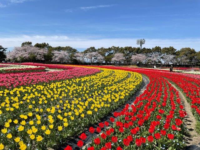 3月上旬から4月上旬。イルミネーションで有名な日本最大級の花のテーマパーク。早咲きの河津桜からソメイヨシノまで。チューリップとのコラボも見どころ