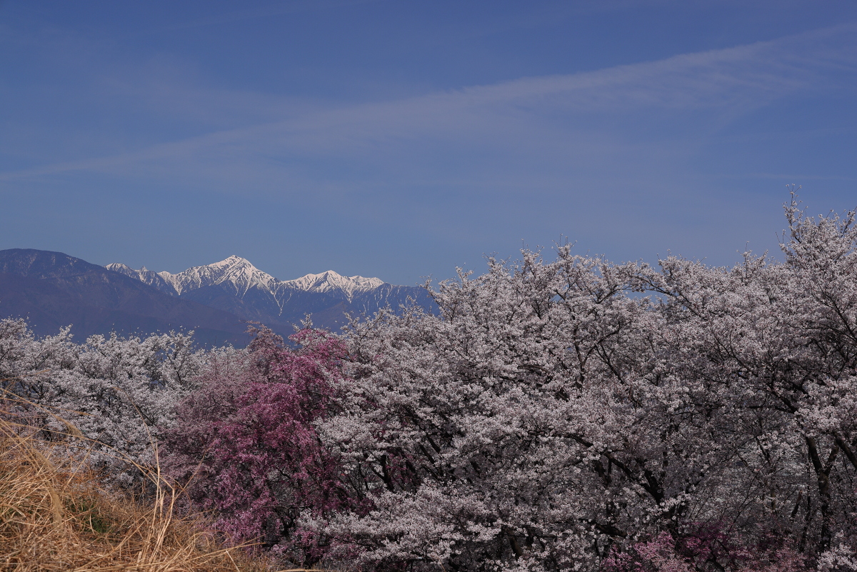 高台は満開の桜で囲まれていた。青空と北アルプスの白も合わさり最強に見える。