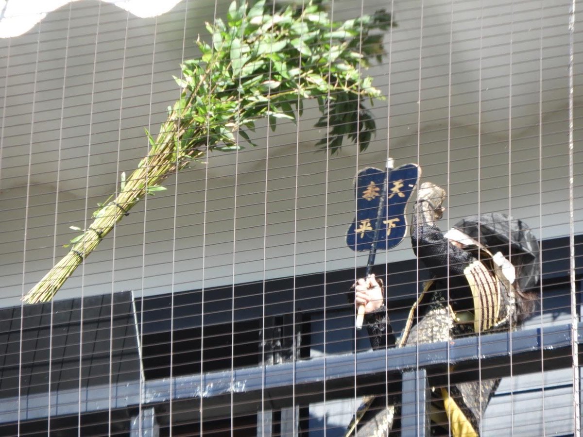 どうも左側の家臣の方の箒が折れて殿にとばっちりがいったらしい