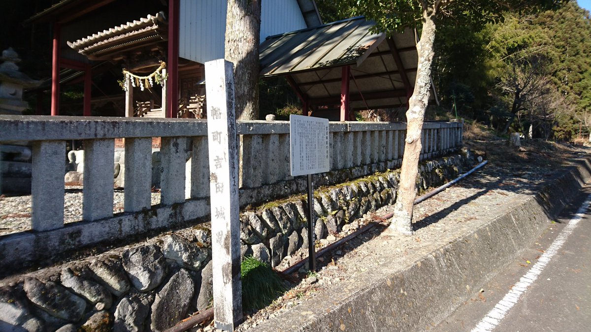 吉田城の東側麓の八幡神社にある木碑①・説明板②、吉田城位置③。吉田城は広大な平坦面となりますが、堀や土塁などの防御施設は設けられていません。 https://t.co/2mG9wlzxpL