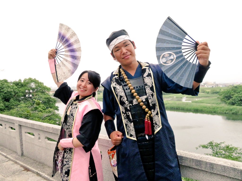 豊橋吉田城で武将隊の方々と記念写真。お子様向けの鎧も着られます。