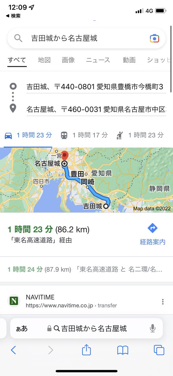 吉田城から名古屋城を車で1時間23分の距離をブルーインパルスは7分で移動するんですね!