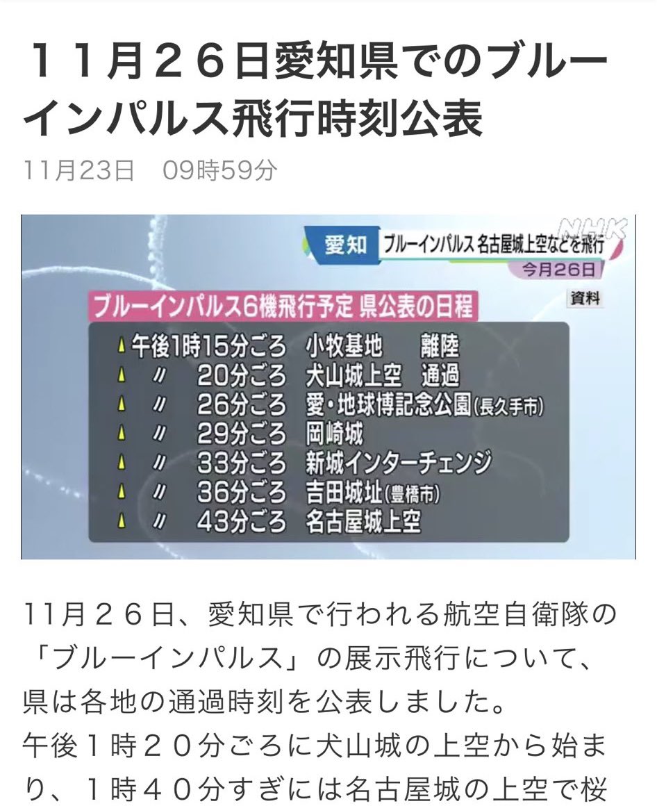 展示飛行は13時から15時頃を予定。小牧基地を離陸し、犬山城周辺、愛・地球博記念公園周辺、岡崎城周辺、新城IC(もっくる新城)周辺、吉田城址周辺、名古屋城周辺 ...