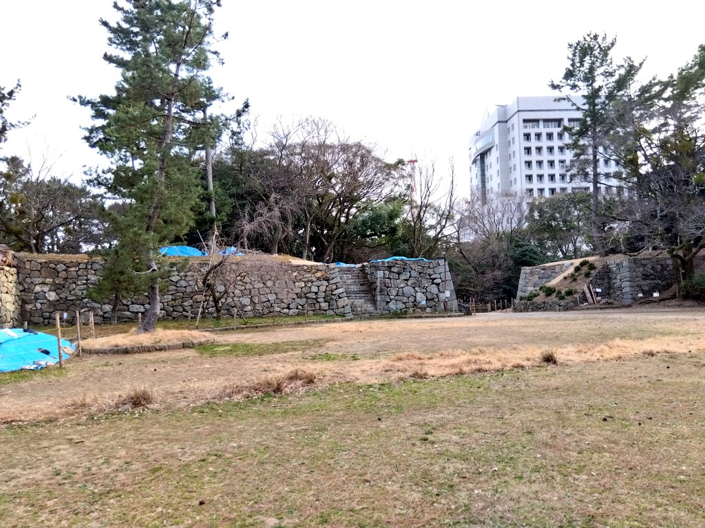 石垣修理の工事壁は撤去されてた。ただ芝生がボロボロになってたから、どうすんのかね…