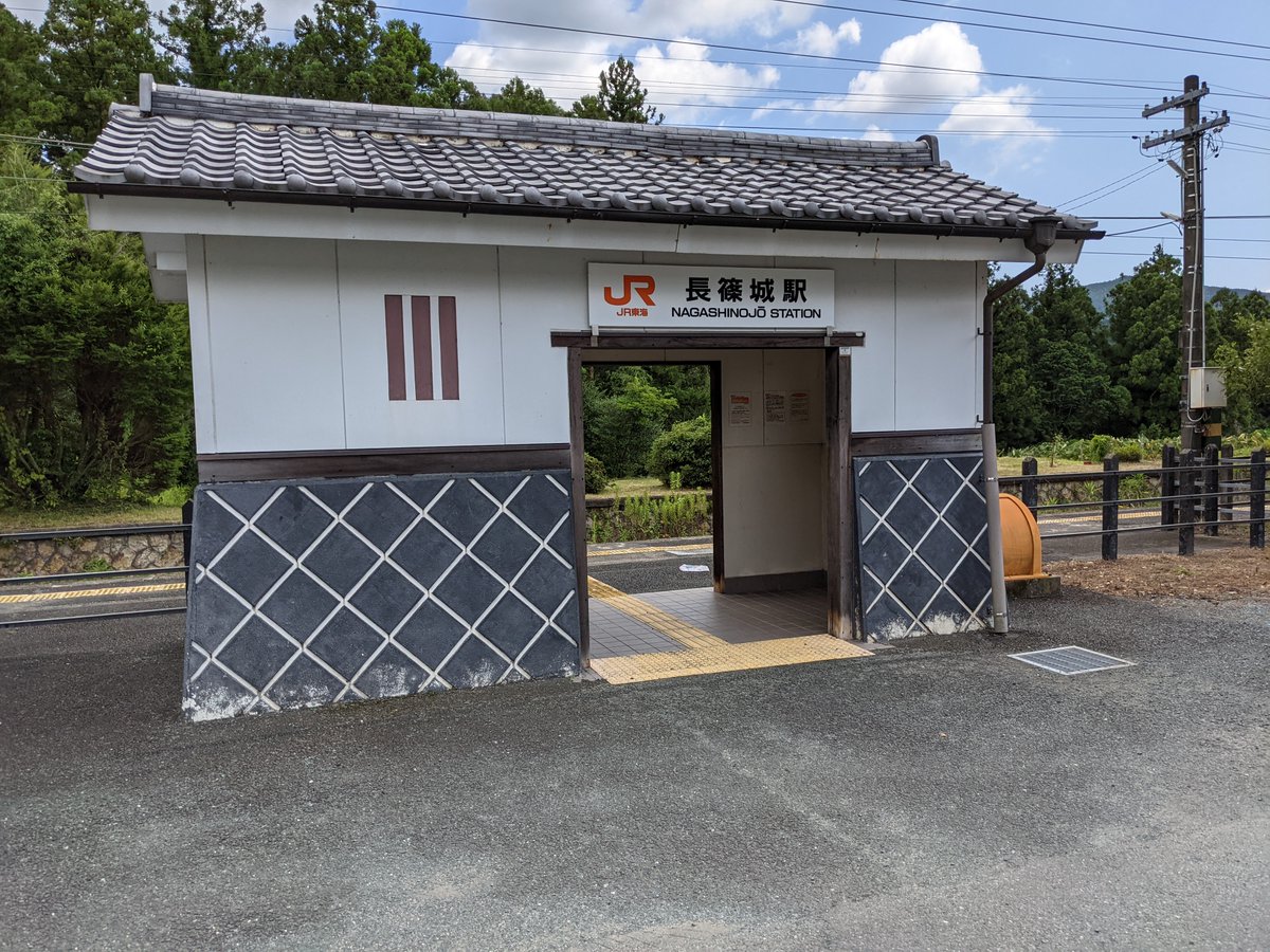 大海から一駅飛ばして長篠城駅に着きました。途中線路から城跡らしい原っぱも見かけられました。駅舎は簡素なコンクリート製ですが城を模した駅舎になっています。付近にはやはり長篠の戦にちなんだ史跡が多くあるようです。 https://t.co/VSr8GUmL7J