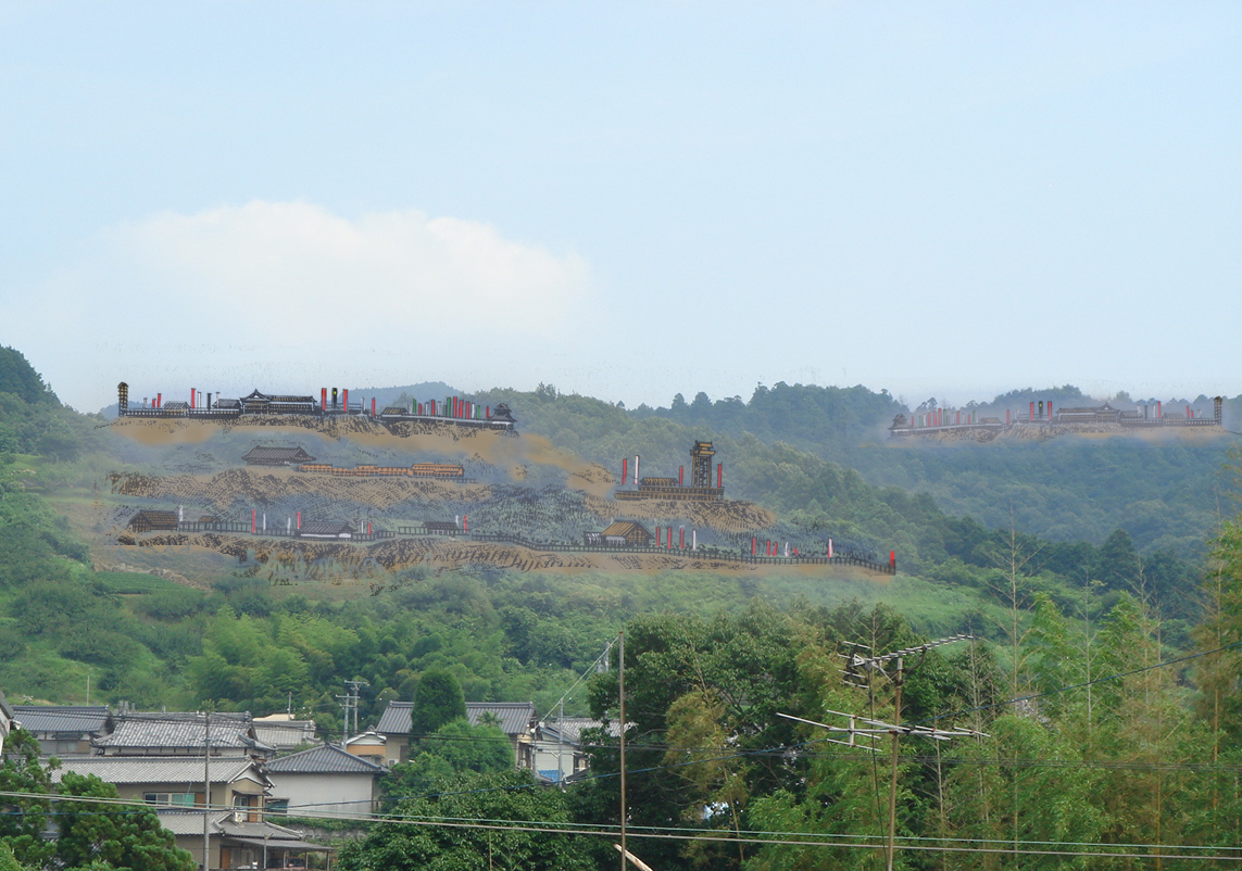 2008年に長篠城を訪れた際、鳶ヶ巣砦の方面を撮影して想像上の鳶ヶ巣砦を配置してみた作品。