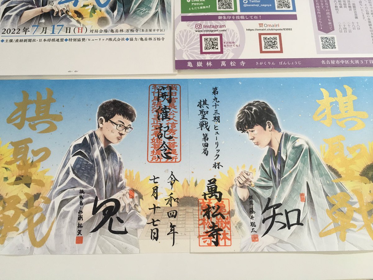 >万松寺は、両対局者の絵が描かれた記念御朱印(1枚1000円)を対局当日の17日まで販売予定だったが、すでに延べ5000枚が完売したため増産し、今月末まで延長を決定。