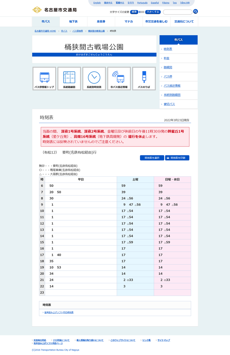 桶狭間古戦場公園バス停の名鉄有松方面のダイヤ