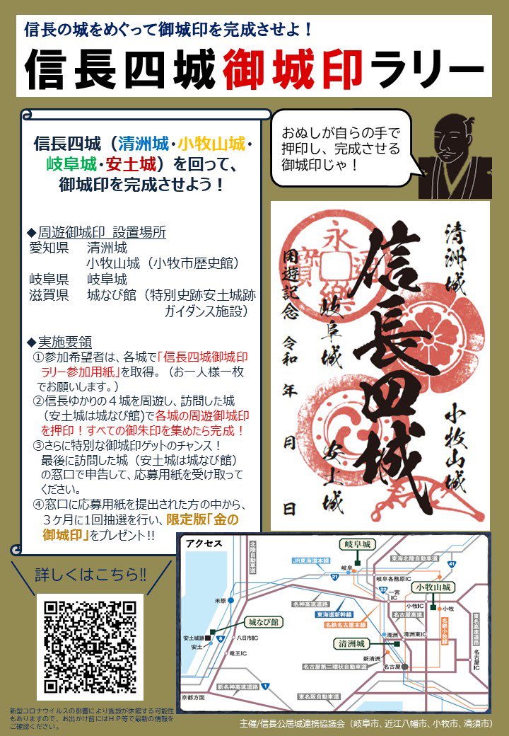 信長四城御城印ラリーを発見。岐阜城、小牧山城(小牧市歴史館)、清洲城、安土城(城なび館)でスタンプを押したら完成!