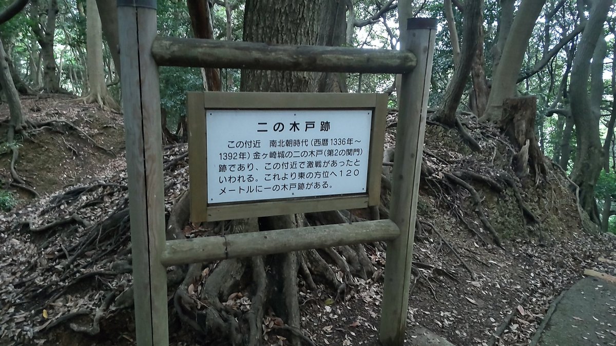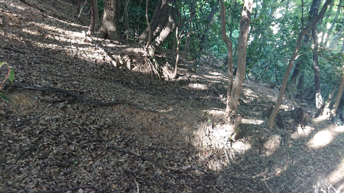 前に堀切もあります、下から見た堀切です。攻め手側からの視点です、案内看板の背面が見えます、道の両側は堀切です。 https://t.co/c5N6IKlPaO