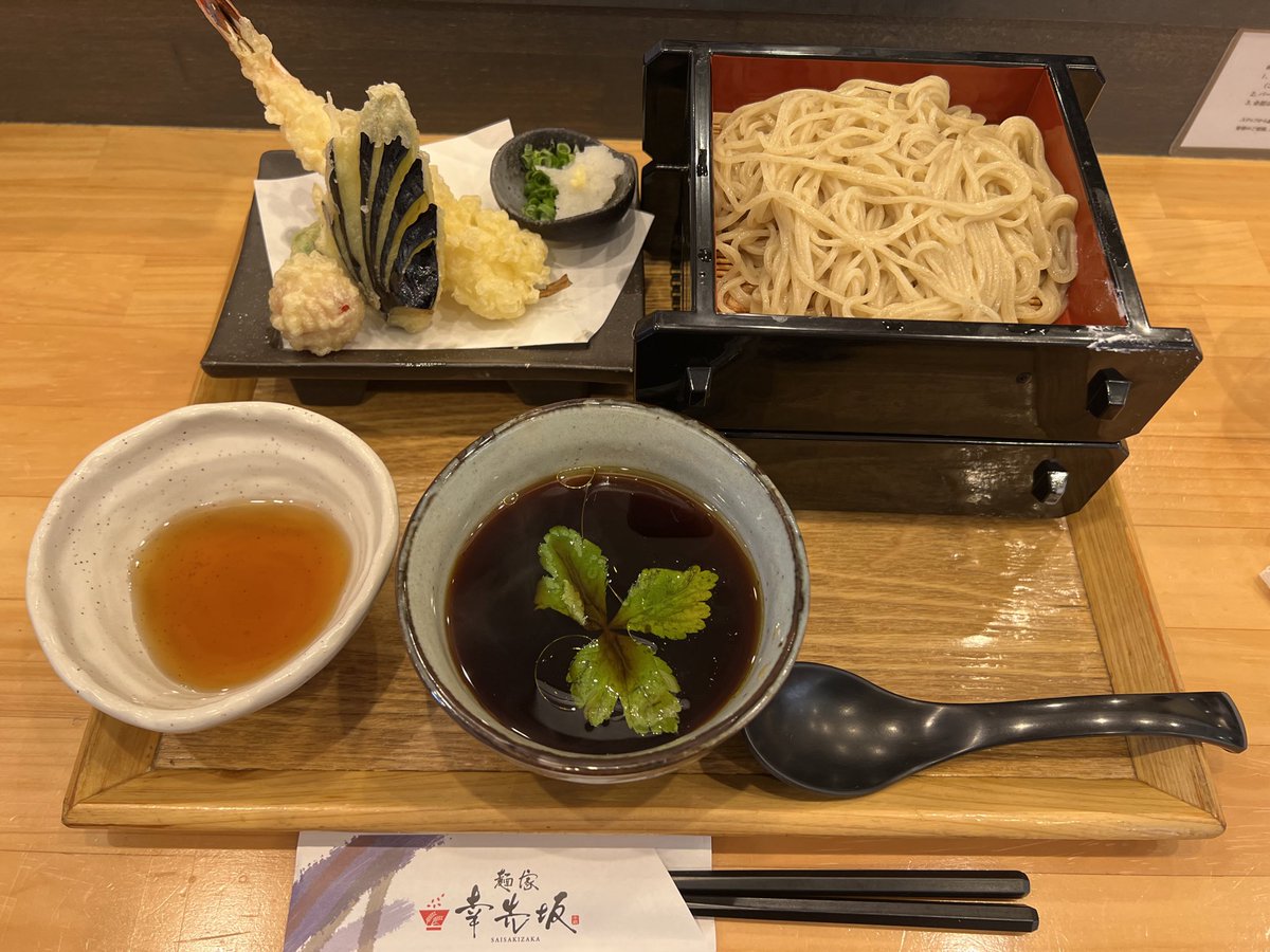今日のランチは鶴舞公園の桜の具合を見るついでに幸先坂さんで大海老天ざるつけ麺をいただきました