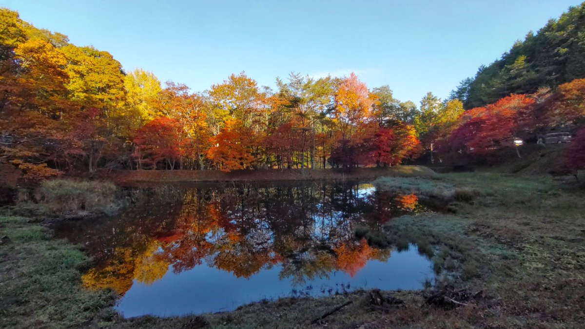 タカドヤ湿地は、標高800メートル、旧稲武町の山道脇のため池周辺でオオモミジなどが下界とは時差で紅葉します。きょうは青空、一段とカラフルな景色でした。 https://t.co/GZrLv5ktEo