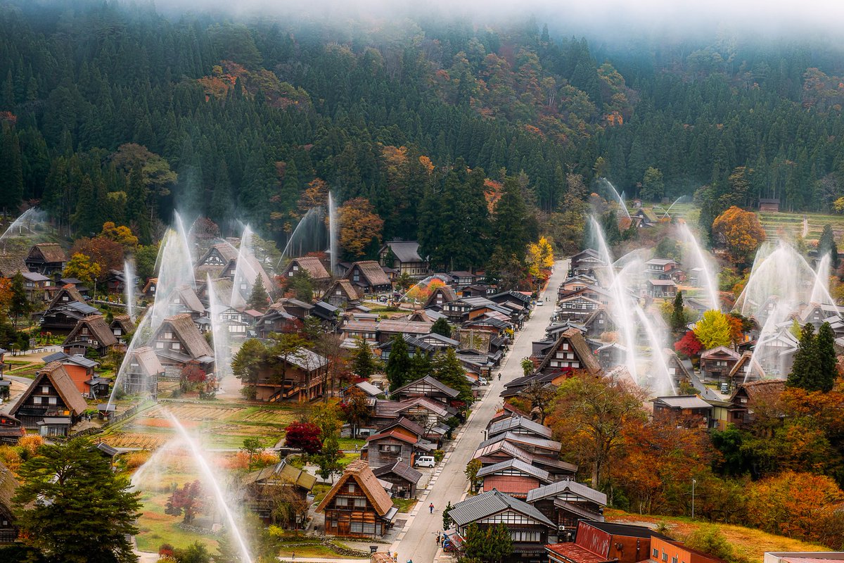 紅葉バックに30メートルの水柱 世界遺産の白川郷で放水訓練 https://t.co/QcAP4it0Ra