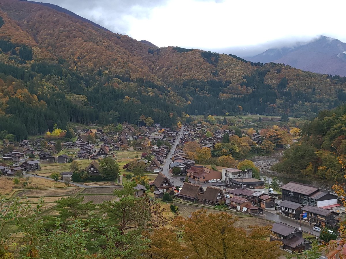 遠くの山の紅葉に合掌造りの屋根が映えてなかなかの風景‼️ https://t.co/mCKEAE1VO7