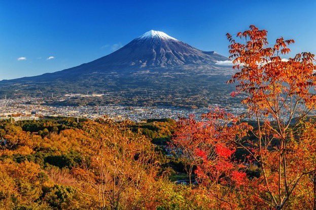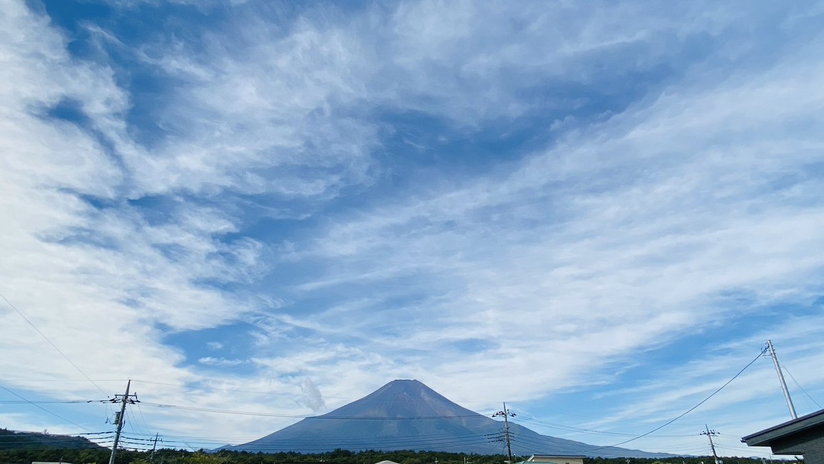 「山粧う」と申しますが、秋の朝の富士山は特に鮮やかに感じます。冬に冠雪して白くなる部分は紫っぽく、裾野は木々の緑に、その境目が茶色っぽく紅葉しているように見えます。美しいです☺️ https://t.co/tkHVMS1uLy