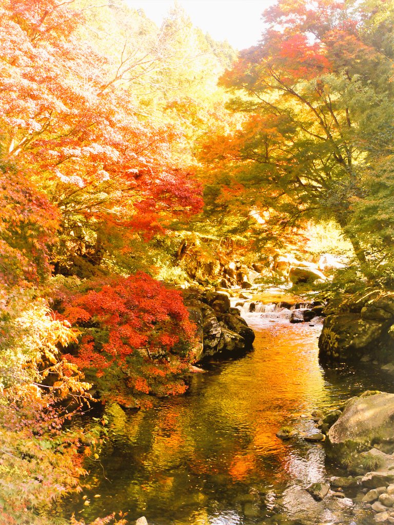 香嵐渓の紅葉は五色紅葉って言われてるほどカラフルなんだよ