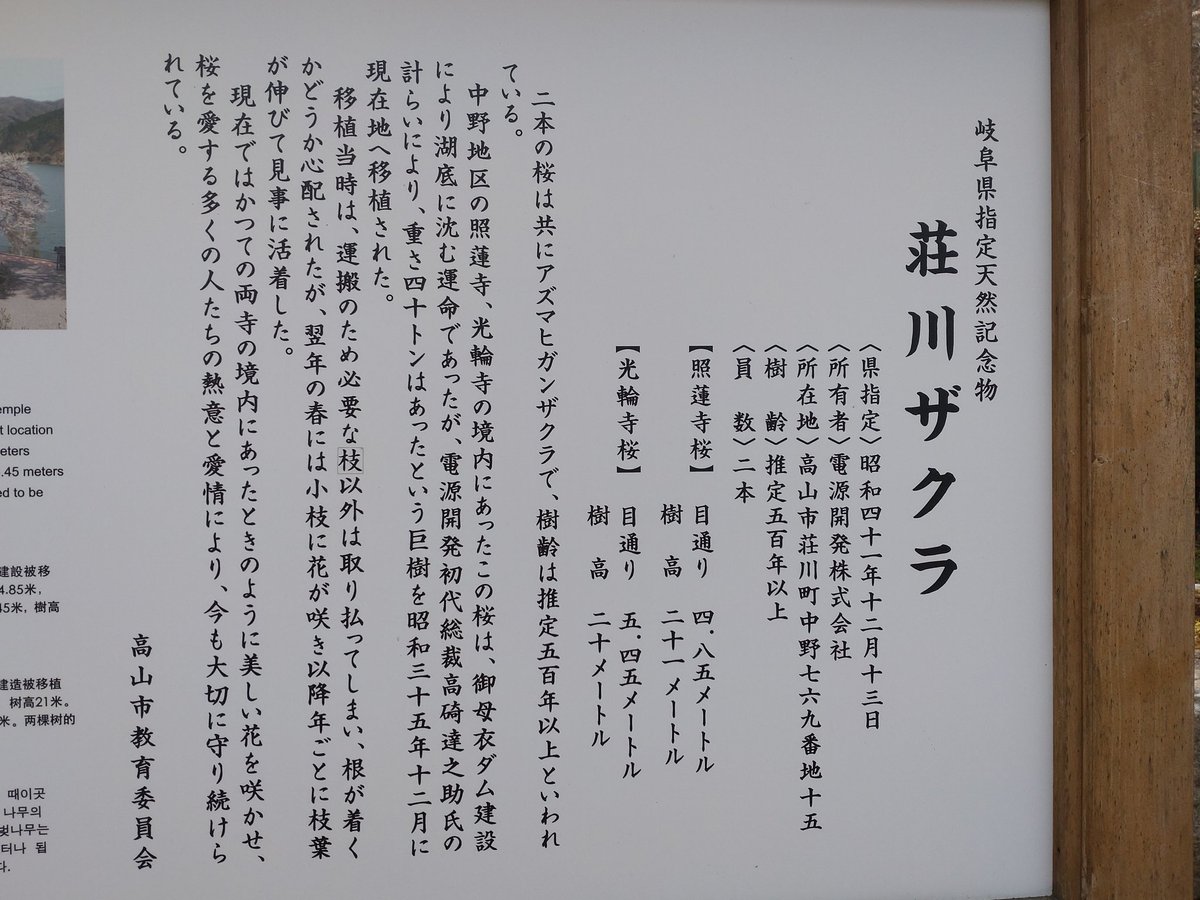 荘川桜は御母衣ダムに沈んだ集落のお寺に植わっていた古木の彼岸桜2本を移植して再生させたとしてテレビでもよく紹介される伝説の桜