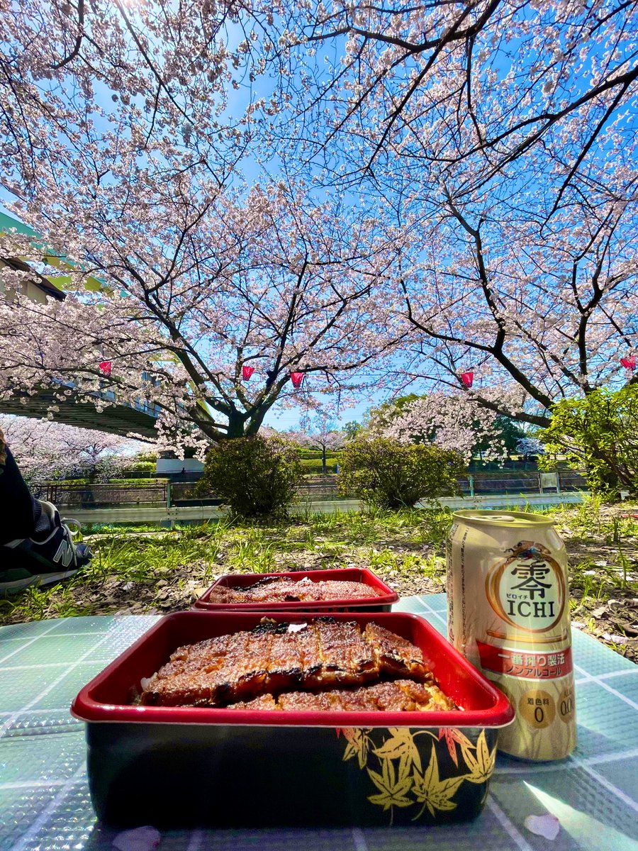 近所の荒子川公園の桜が見頃だったので鰻弁当買ってお花見。俺クラスになると息を吸う様に特上。ドライバーだからノンアル。 https://t.co/APBqo6r43m
